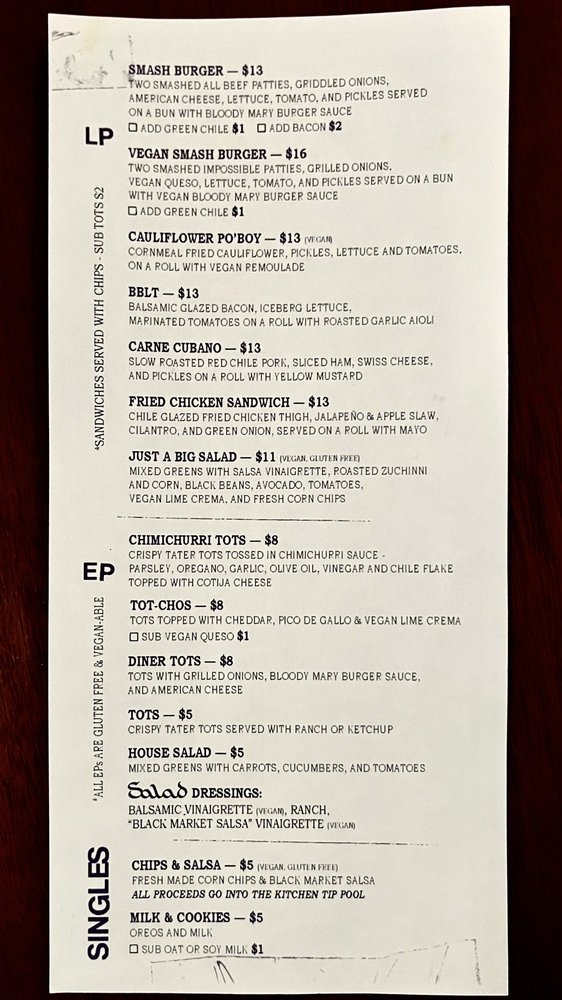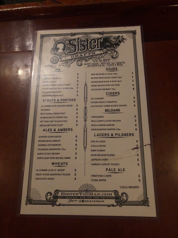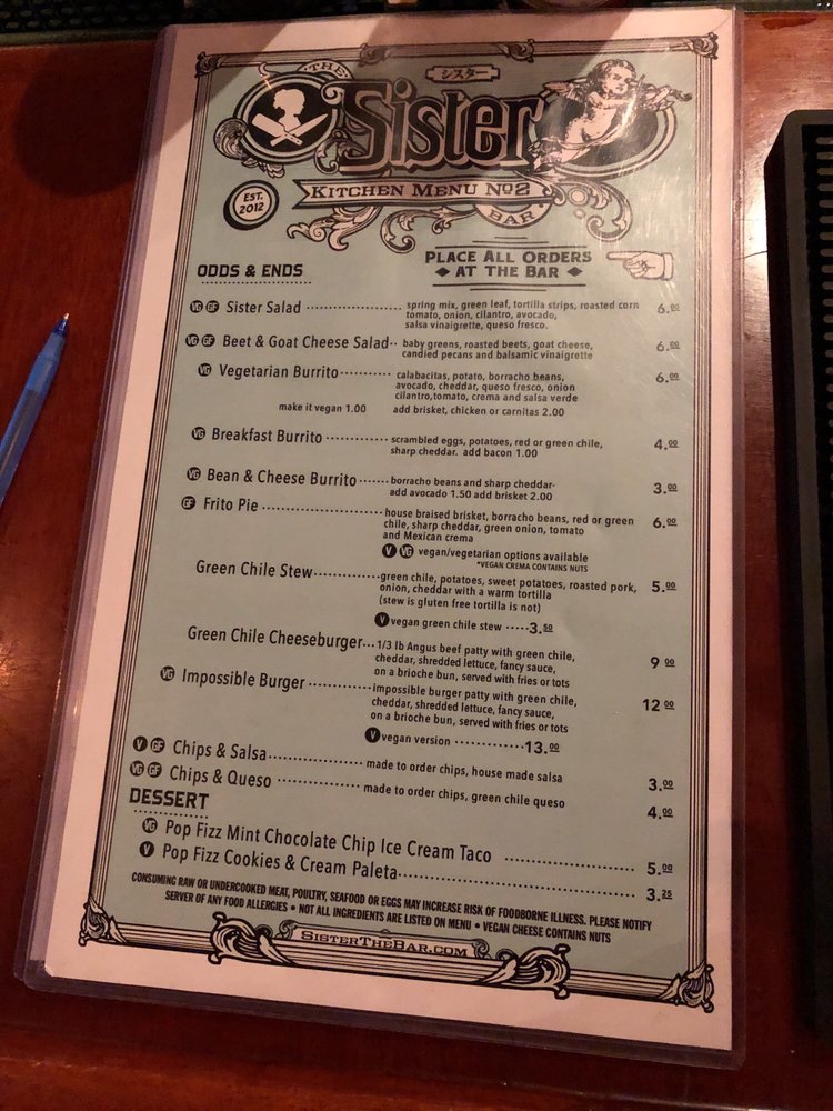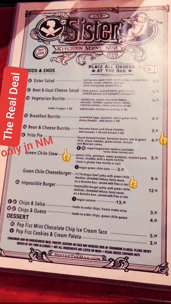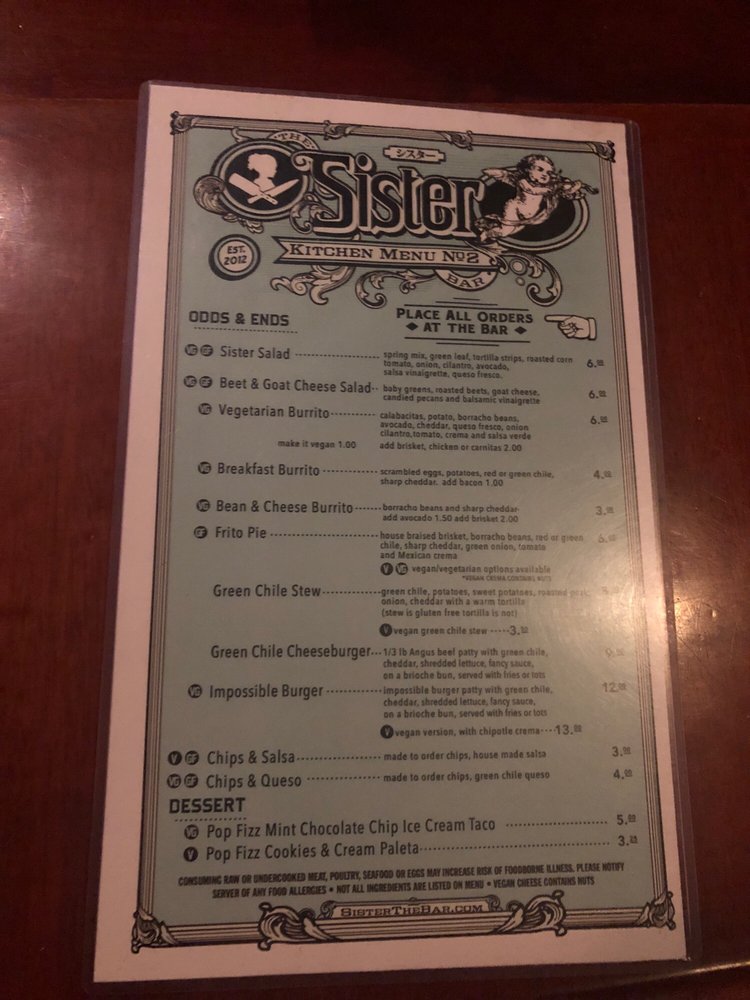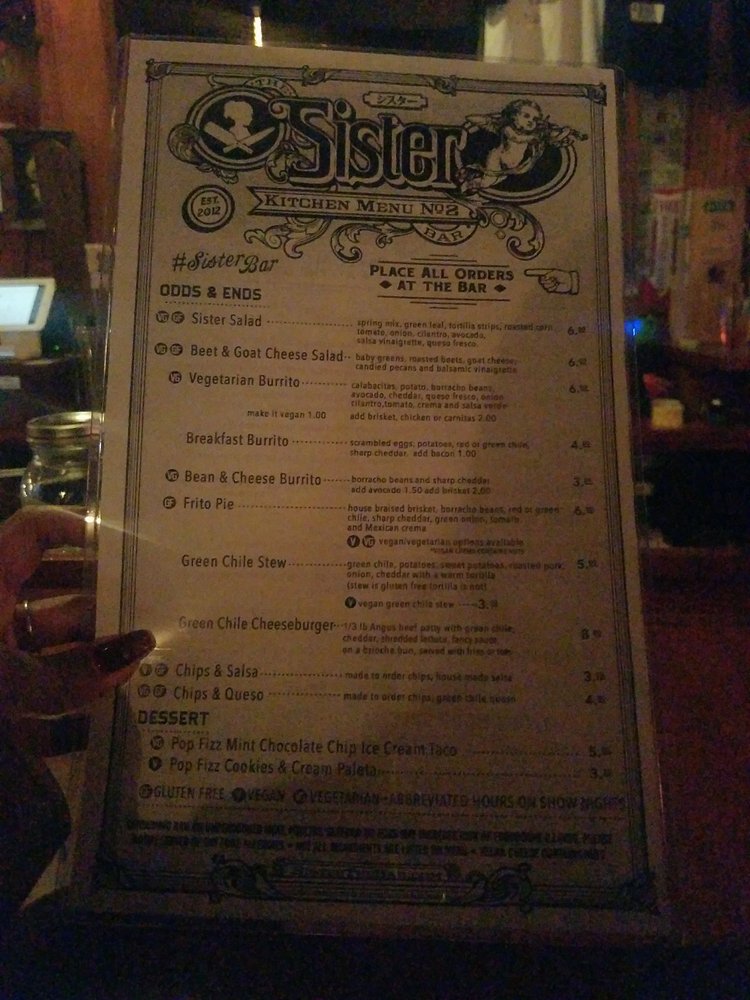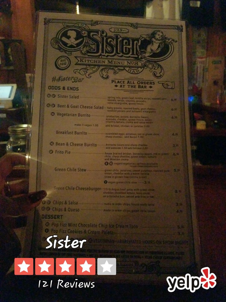 Sister, a New American bar located in Albuquerque, NM, offers a diverse menu with options for everyone. This Latinx-owned establishment provides a vibrant atmosphere for guests, complete with live music, happy hour specials, and a full bar. The menu features vegan options, making it inclusive for all dietary preferences. With amenities like outdoor seating, free Wi-Fi, and pool tables, Sister is suitable for various occasions, from lunch to late-night gatherings. The restaurant also caters to families, with good options for kids. The energetic vibe, along with the delicious food and excellent service, makes Sister a standout dining destination in the area. Don't miss out on experiencing the eclectic flavors and lively ambiance at Sister.